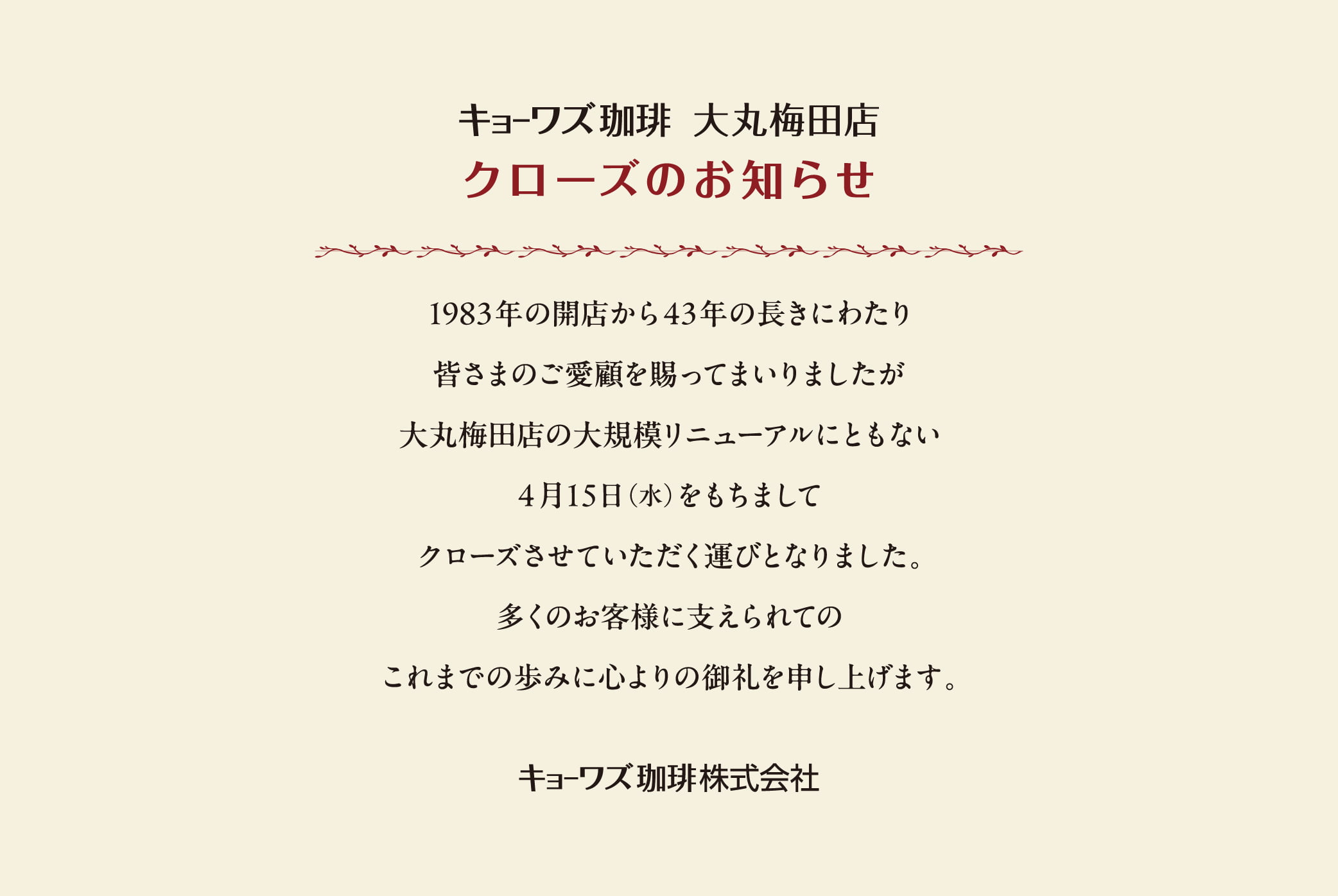 1983年の開店から43年の長きにわたり皆さまにご愛顧を賜ってまいりましたが