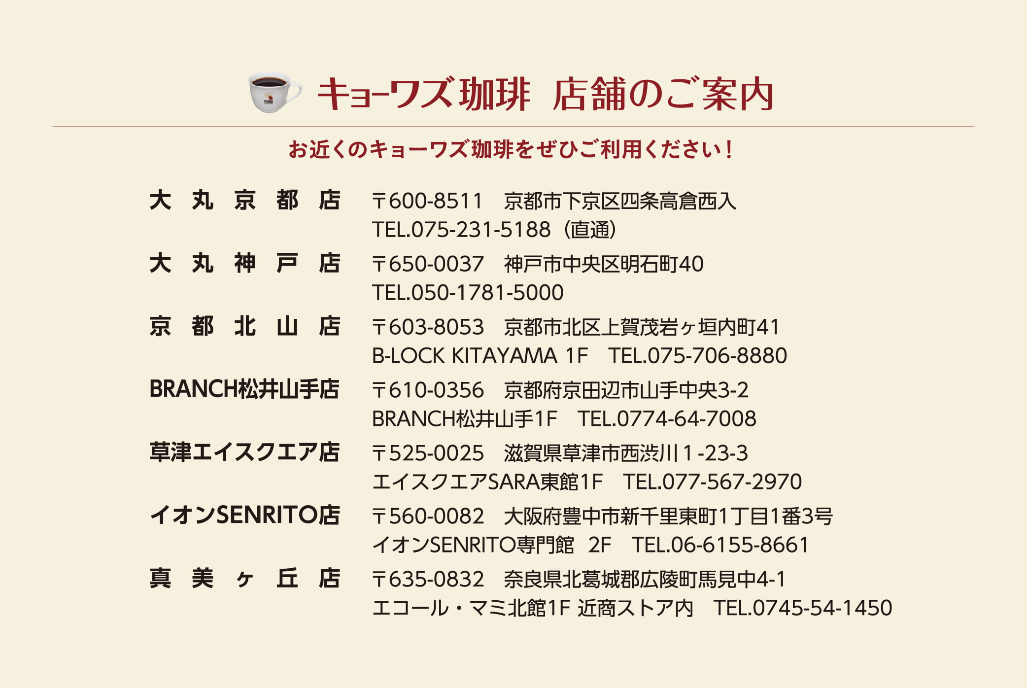 尚、クローズ後はキョーワズ珈琲各直営店ならびにオンラインショップにてご購入賜りますよう引き続きましてのご愛顧をお願い申し上げます。